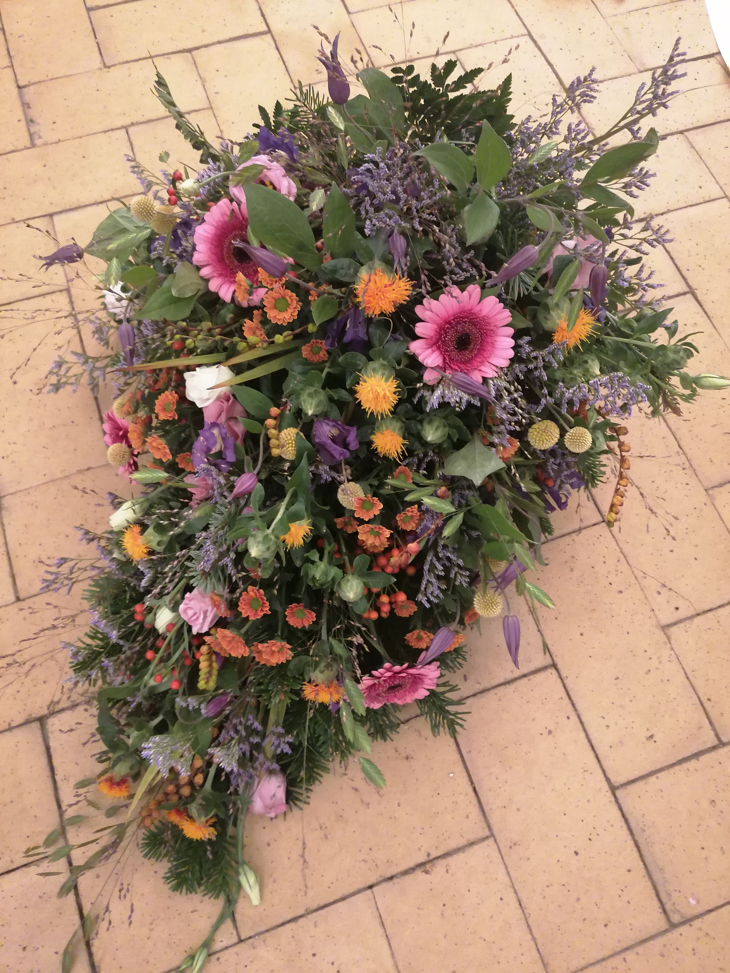 Bårebuket bundet i multi farver. Blomster kan variere efter sæson