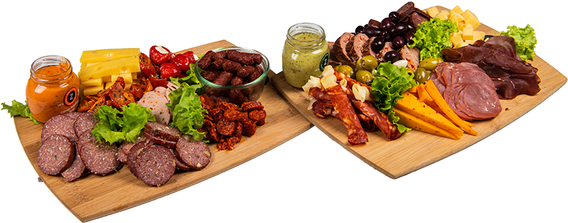 Lakseroulade Græske frikadeller med tzatziki Mini croissant med hønsesalat Kyllingespyd Landskinke med melon Pate med drueagurk Dadler med bacon Brie og bjælke ost med druer Oliven Pesto