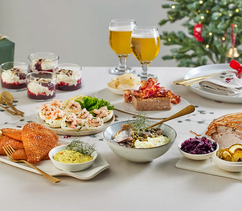 • Kamsteg med rødkål og agurkesalat • Leverpostej med bacon og asier • Fiskefilet med remoulade og citron • Æg med rejer, citron og mayonnaise • Marineret sild med karrysalat og kapers • Risalamande med kirsebærsauce