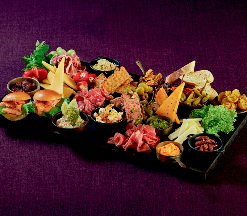 Menu til 2 personer indeholder: • Lakserilette med citron, dild og kapersbær • Hvidløgsmarinerede rejer med chili-mayonnaise • Sliders med koldrøget laks, hollandaisesauce og sprød salat • Bresaola med grøn pesto og parmesanflager • Salami Milano med semidried tomater og artiskokcreme • Serranoskinke med oliventapenade og saltede mandler • Italiensk-inspireret paté med cornichoner • Rotterdam-ost med nødder og akaciehonning • Chili-gouda med jordbær og vindruer • Oliven • Fyldte peberfrugter med flødeost • Knækbrødschips med havsalt • Rugbrødschips med salt • Flutes