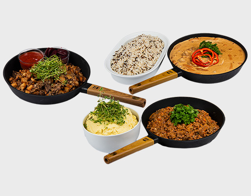 Kalvesteg stegt som vildt, waldorfsalat, agurkesalat, tyttebær, bønner, hvidekartofler og brun sovs.